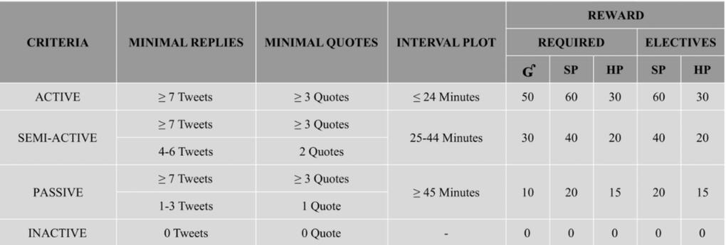 Saat kelas berlangsung, usahakan untuk selalu aktif. Poin penting yang harus diperhatikan adalah tingkah laku atau tindakan ❨plot dan retweet❩. Poin ini harus dilakukan. Bila tidak dilakukan, maka reward kelas tidak bisa maksimal.